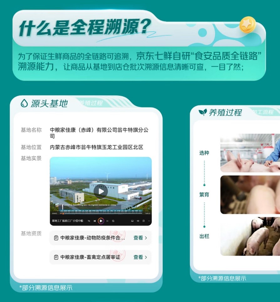 目前,京东七鲜App取小法式已上线数十款支撑“全程溯源”的生鲜商品,涵盖肉类、海鲜、蔬菜、生果等多个品类。以180天白猪冰鲜猪肋排、深海野逛大黄鱼、富硒菠菜苗、正在泉源管控环节,能够逃溯到种植/养殖具体、各类天分证明、能够实现运输体例取运输温度监测记实;入库仓储部门,能够实现入库质检成果、检测演讲的系统化留存;城市配送、门店发卖等环节则实现了商品流、温度、进店检测演讲等全环节记实及。六大畅通环节消息完整,形成实正意义上的“端到端”保障。